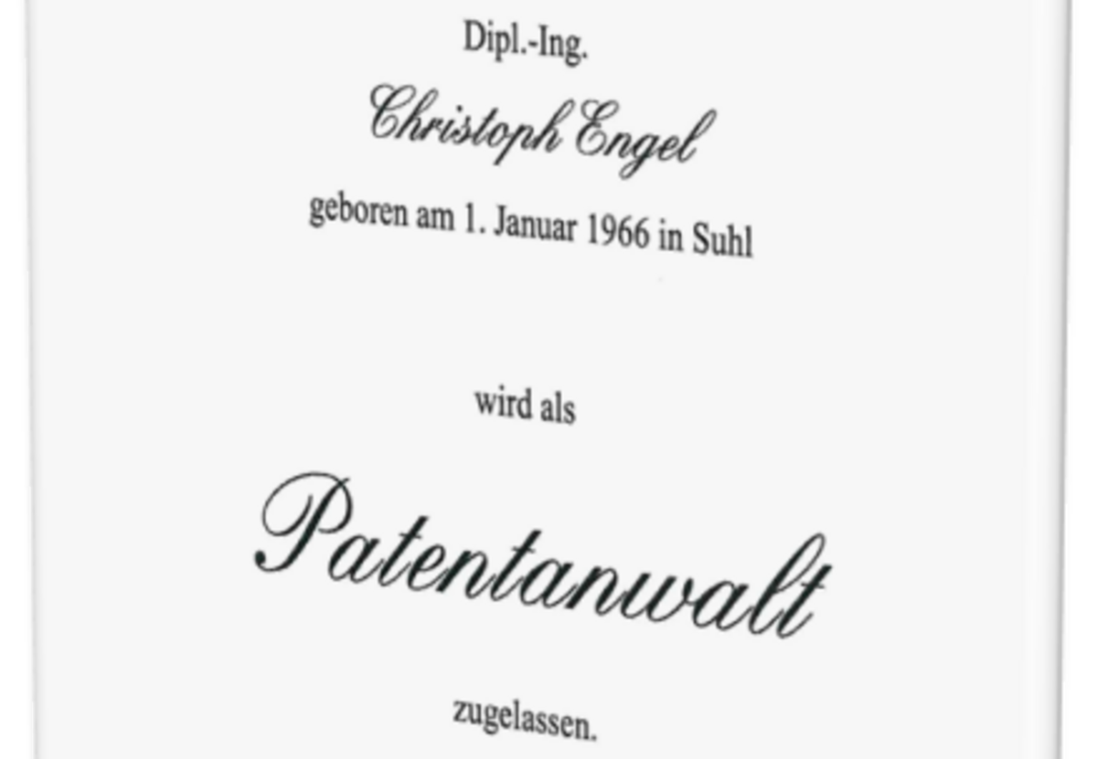 Am 25. Januar 1996 wurde Christoph Engel in Deutschland als Patentanwalt zugelassen.